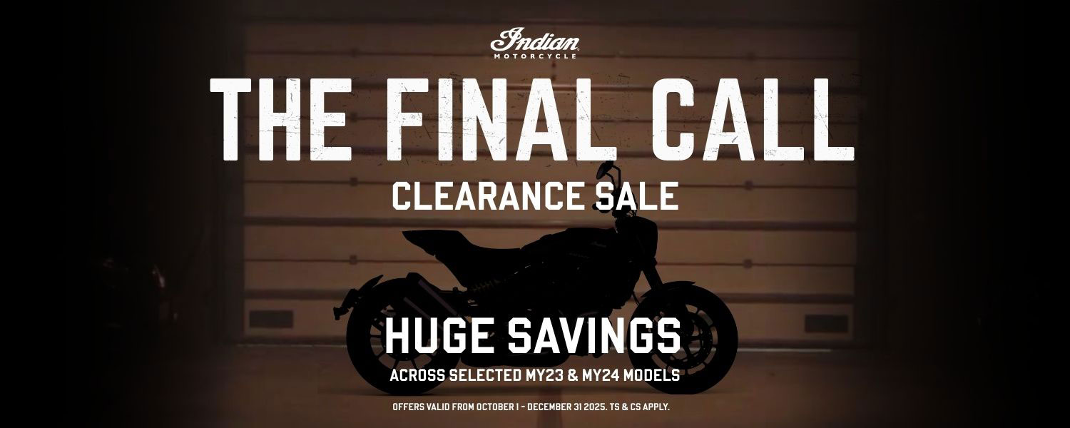 Offer ends 31/12/25 or while stocks last. Applies to new or demonstrator MY23 and MY24 models listed above, in-stock and at participating Indian Motorcycle dealerships. Not valid with any other offer.